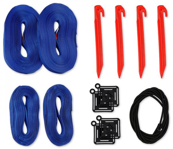 Eine leichte Spielfeldmarkierung für den mobilen Einsatz, mit 25 mm breitem Gurtband in blauer Farbe. Die leichten Gurtbänder lassen sich komfortabel transportieren und das Auslegen der Courtline geht dank der roten Kunststoffheringe sehr schnell.