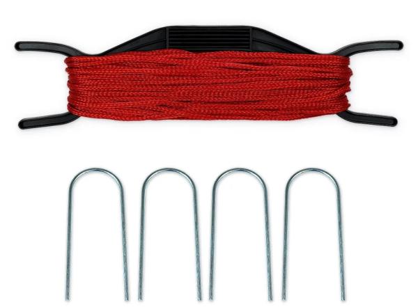 Das 5,5 mm starke gelbe Polyseil ist auf einer praktischen Haspel aufgewickelt. Die U-förmigen Metallheringe sorgen für Verankerung an den Spielfeldecken, ideal auch im Garten oder auf anderen Rasenflächen. Die Fun Volley Courtline hat das Maß 8 x 16 m.