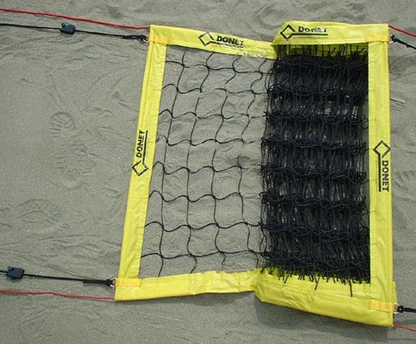 Ringsum mit neongelber PVC-Einfassung, 75 mm breit. Spannseil ca. 6 mm, 10,7 m lang, seitliche Stabilisierungsstäbe (GFK) vernäht und seitliche Spannleinen. Oben mit Donet Werbeaufdruck.