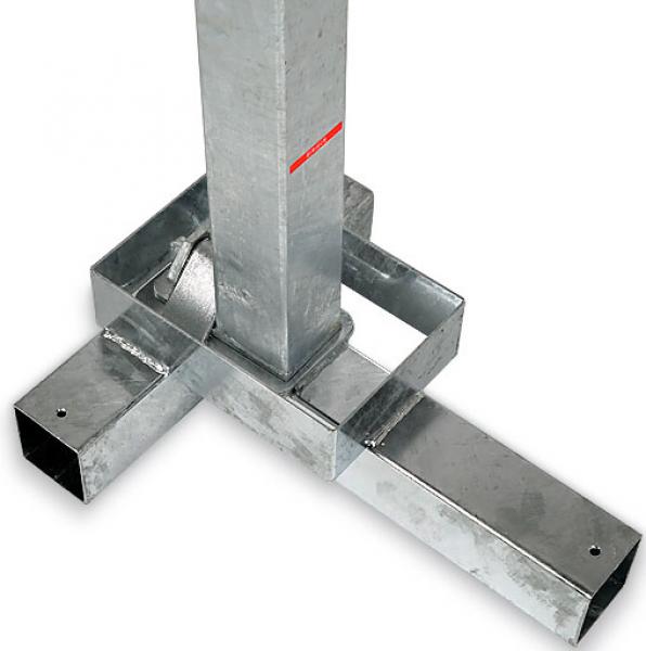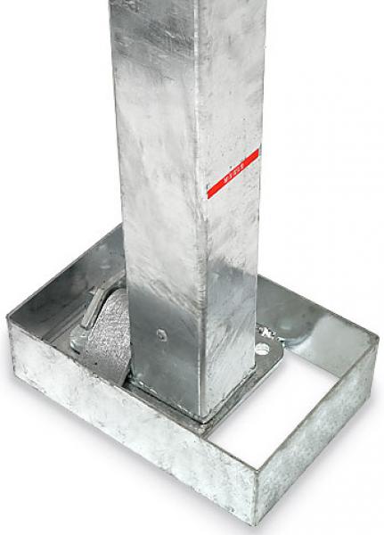 Die abnehmbare Bodenhülse Switch wird mit einer passenden Bodenplatte verwendet. Die Hülse kann mit wenigen Handgriffen von der Bodenplatte abgenommen werden. Die Bodenplatten wiederum gibt es zum Aufschrauben auf ein bauseitiges Fundament oder als freistehende Variante zum Aufstellen mit Hilfe von Holzbalken.