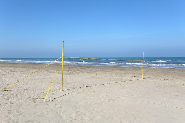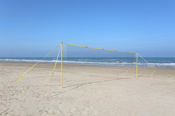Im Lieferumfang ist auch eine Spielfeldmarkierung (8 x 16 m) aus 5 mm starkem Polypropylen-Seil enthalten. Sie ist auf einer praktischer Haspel aufgerollt und es liegen U-förmigen Bodenanker aus Stahl bei.