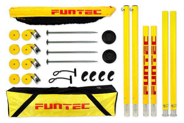 Das Pro Beach Set wird mit dem FUNTEC-Abspannsystem aufgebaut: Die unteren Spannleinen werden direkt zu den Spanngurten geführt. Die Netzpfosten stehen dadurch extrem stabil und die Netzspannung ist perfekt für ein Spiel auf hohem Niveau.