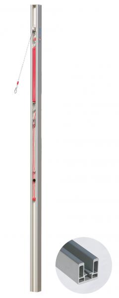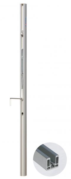 ALU-Volleyball-Pfosten aus stabilem Rechteckprofil 80x80 mm, nach der neuen EN 1271 geprüft und abgenommen. Superstabile Ausführung inkl. Schieber mit innenliegender Rolle und Spannvorrichtung, Kurbel sowie Netzhaken.